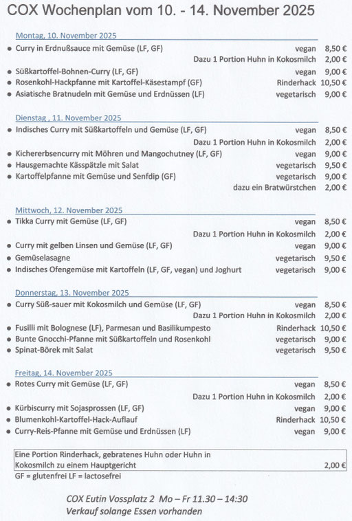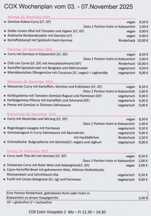 Vom 27. - 31. Oktober macht das COX eine kleine Pause. Am 03. November sind wir wieder an den Kochtöpfen!